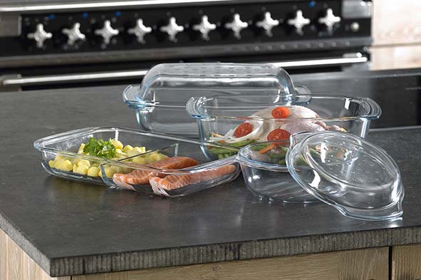 In deze vuurvaste glazen ovenschalen laat je gerechten gaar worden met waar genot. Sterk is het glas, elegant is de schaal. In de oven, in de magnetron. Overal. Voor een gezond, hygiënisch, veilig en praktisch gebruik. Met het 'grill and drop' systeem. De geribbelde bodem vermindert de kans op aanbranden en aankleven van het gerecht. Op de noppen aan de binnenzijde van het deksel verzamelt zich de waterdamp die dan gelijkmatig op het gerecht druppelt, zodat het niet uitdroogt.