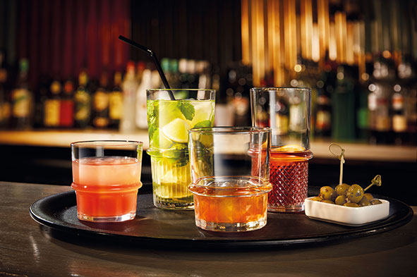 Een collectie In gehard glas. Ergonomisch en stapelbaar, met ideale maten voor barservice.