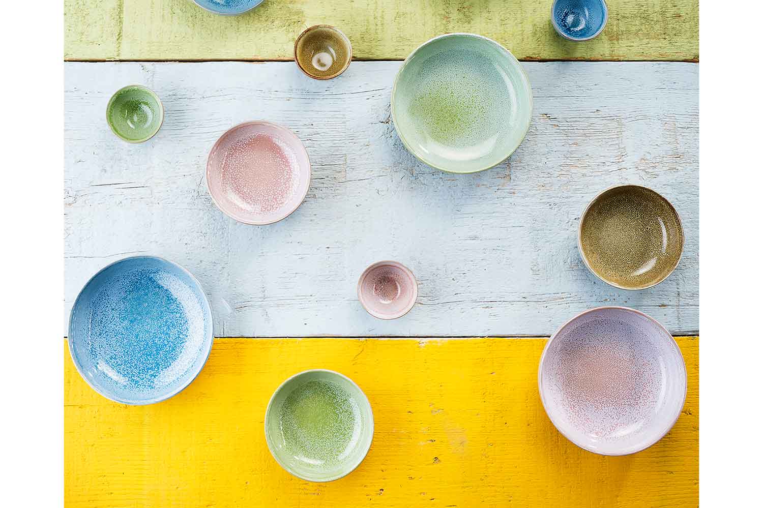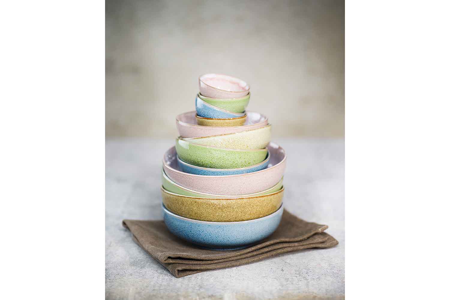 Een collectie sprankelende schaaltjes in aardewerk. Allemaal voorzien van een gespikkelde gladde afwerking. De serie heeft schaaltjes in drie formaten en vier zachte kleuren die samen jouw aperitieftafel opvrolijken. Gebruik de grotere schaaltjes voor chips en hapjes. De leuke minischaaltjes zijn ideaal voor sausjes.